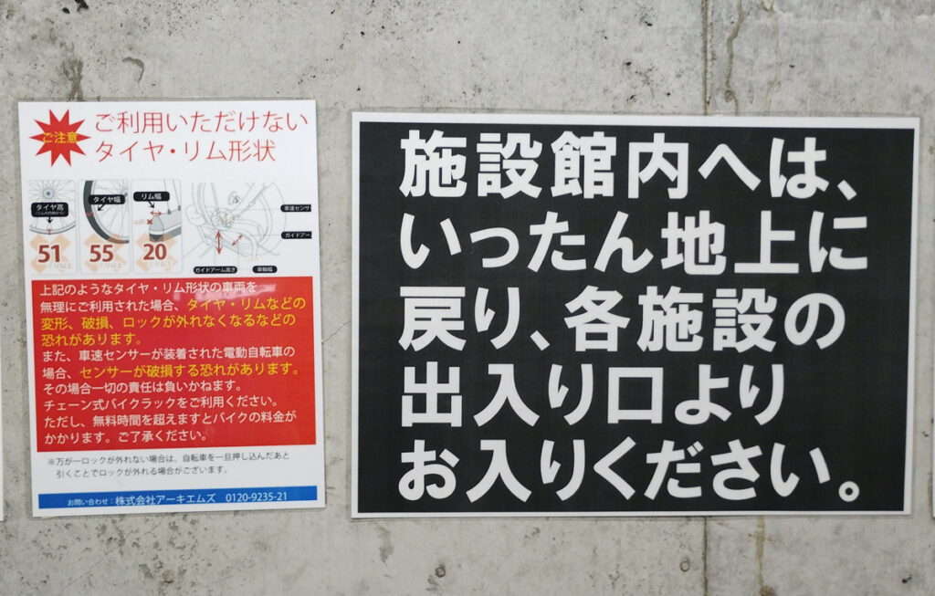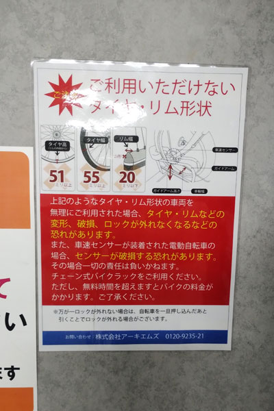 利用できないタイヤ・リム形状の注意書きがあります。特殊車両については、チェーン式バイクラックを利用する旨が記載されています。南館と全く同じ。