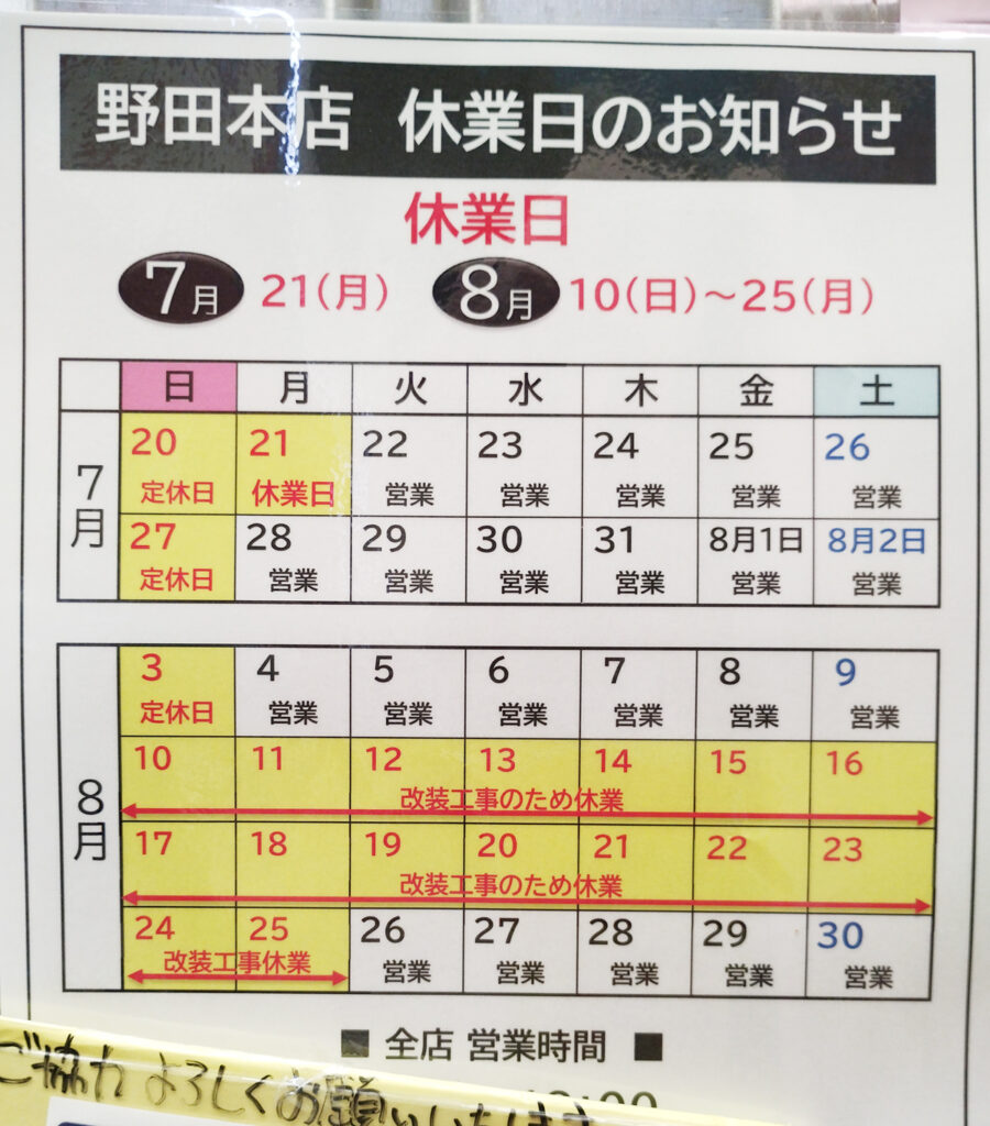 野田新橋筋商店街の八百鮮 野田本店が、2025年8月10日~25日まで改装工事のため休業となっています。昨年8月に改装工事をしたばかりなんですが、どう変わるんでしょうかね。レジまで一方通行なのが私の身の回りでは若干不評だったんですが、そこが改善されるといいなぁと思っています。