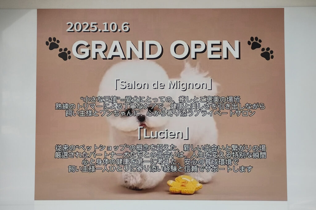 ペットの「Salon de Mignon 」「ルシア」が2025年10月6日にオープンするようです。どんなお店かは公式インスタグラムをご確認ください。