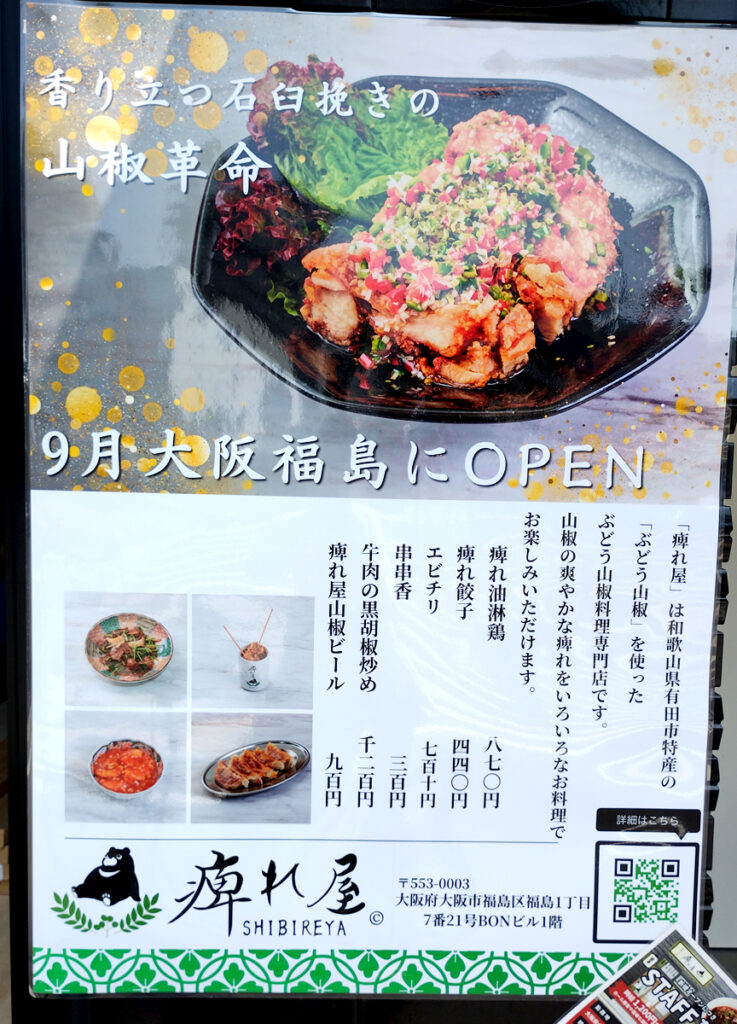 2025年8月15日にオープンした「MAZE CAFE STATION」の横に、ぶどう山椒専門店「痺れ屋」が2025年9月でオープン予定となっています。メニューも掲示されていました。ぶどう山椒を使った専門店ということですが、どれも辛そうで大人の味って感じがします。辛いもの好きとしてはかなり興味があります! なかなか尖った専門店ですが、これぞ福島区グルメって感じがしますね。こりゃぜひ行きたいです。