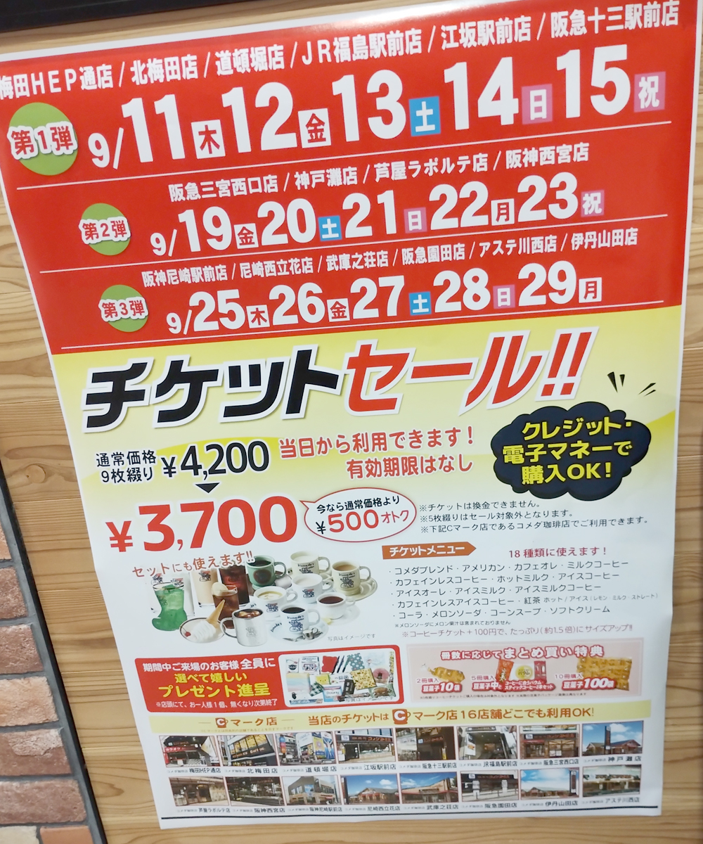 コメダ珈琲店でお得なチケットセールが開催中。店舗によって分かれているみたいで、JR福島駅前店では第一弾の9月11日~9月15日が販売期間となっていました。よく行く方はこの機会に買ってみては。