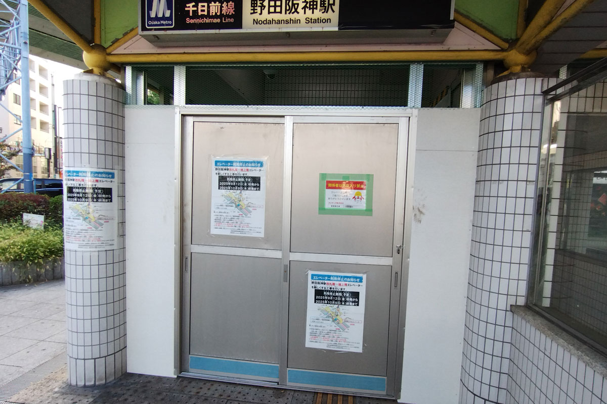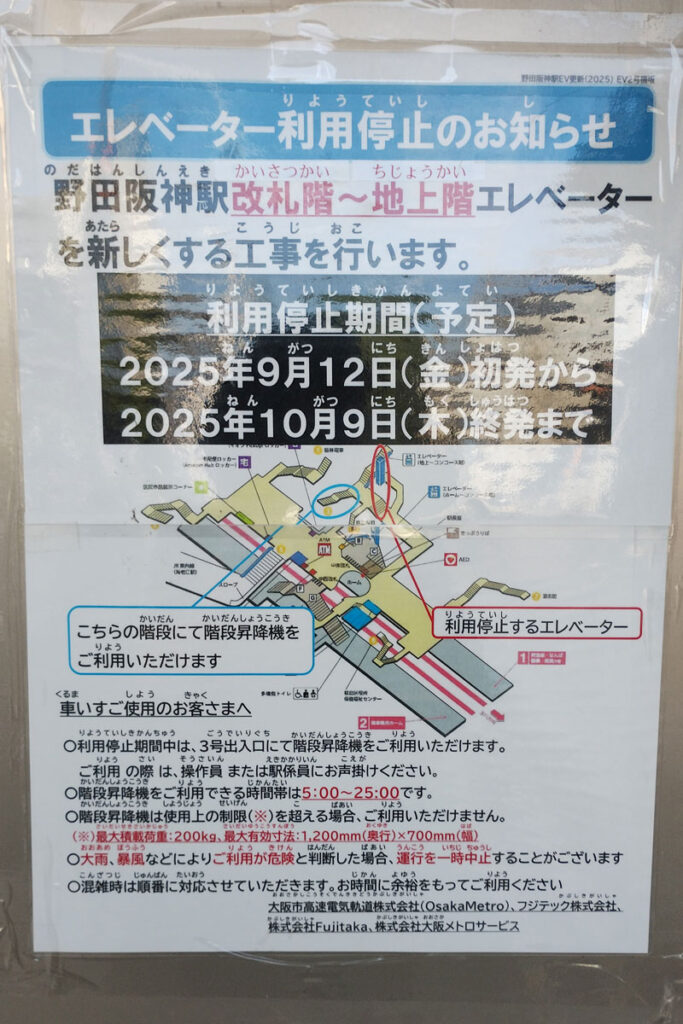 掲載をすっかり忘れてました。阪神線野田駅前にある、大阪メトロ野田阪神駅に通じるエレベーターが工事中となっています。工事期間は2025年9月12日~10月9日まで。車いすをご利用の方などのために、階段昇降機や係員も在中されてました。暑い中お疲れ様です。東西線海老江駅の北側2番出口にもエレベーターはありますがめっちゃ遠回りになりますのでご注意を。