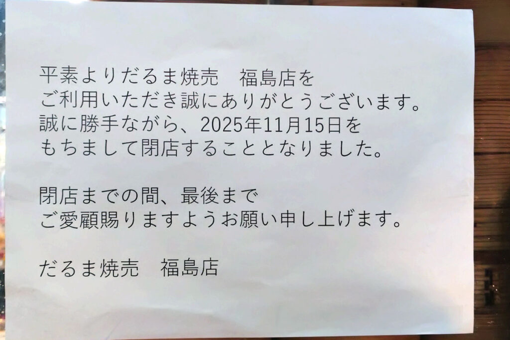 JR環状線・福島駅前のビル1階にあった「だるま焼売福島店」が2025年11月15日で閉店となっています。けっこうランチとかで人は入っていたイメージなんですが。