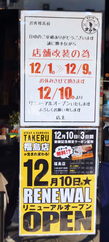 先日に「ステーキ&ハンバーグのタケル福島店」で中華弁当が買えるという記事を書いたばかりなのですが、2025年12月1日~9日でリニューアル工事をするようです。で、12月10日(水)にはリニューアルオープンとなり、営業時間を見る限りはランチも復活するみたいです。新装記念で限定クーポンも配布されるようなので、よく行かれる方はチェック。