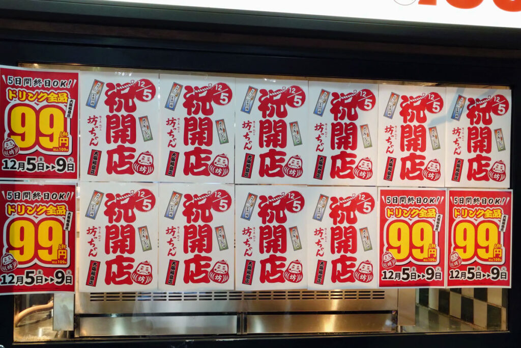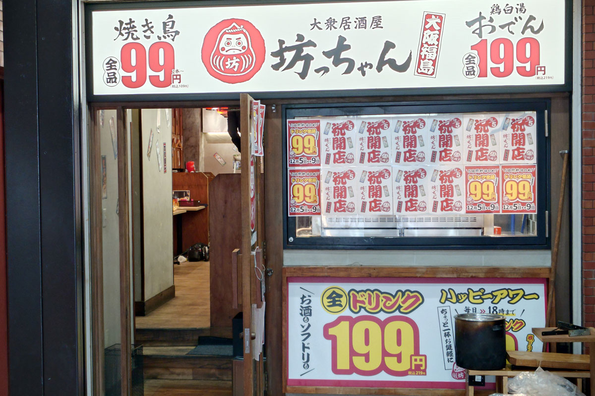 先日の記事でお伝えしたように、JR環状線・福島駅前の「だるま焼売福島店」が閉店し、「焼き鳥おでん坊っちゃん 大阪福島店」が2025年12月5日オープンとなっています。オープン記念もあるみたい。