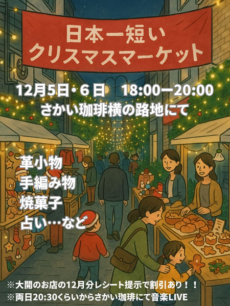 野田阪神駅前通りから裏筋に入ったところにある「さかい珈琲」さん横路地で、「日本一短いクリスマスマーケット」が12月5日(金)・6日(土)の2日間にわたって開催。主催は「さかい珈琲」さん。