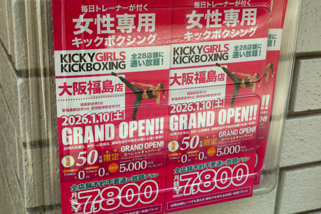 福島年金事務所から北側、福島聖天通商店街の「珈琲館タマイチ」から南側に位置したマンション一階に、KICKYガールズキックボクシング大阪福島店が2026年1月10日(土) オープン。