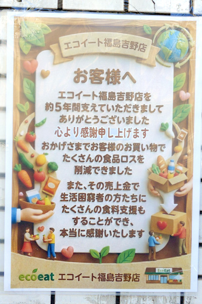 食品ロス削減ショップ「エコイート福島吉野店」が、2026年1月18日に閉店となっています。玉川からこちらに移転してきたのが2021年12月1日だったので、およそ4年ほどの営業となりました。