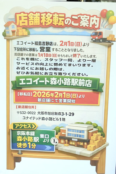福島吉野店としては閉店となりますが、ecoeat 森小路駅前店として2026年2月1日にオープンするそうです。お店の名前の通り、京阪電車の森小路駅の目の前なのですが、福島区からはめっちゃ遠くなってしまいます。お宝発掘感覚で云っていたので非常に残念です。