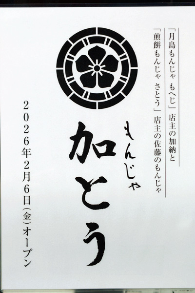 JR環状線福島駅高架下にあった「月島もんじゃおこげ 大阪福島」が改装中だったのですが、「もんじゃ加とう」という名前の店になるようです。またもんじゃです。オープンは2026年2月6日(金)。