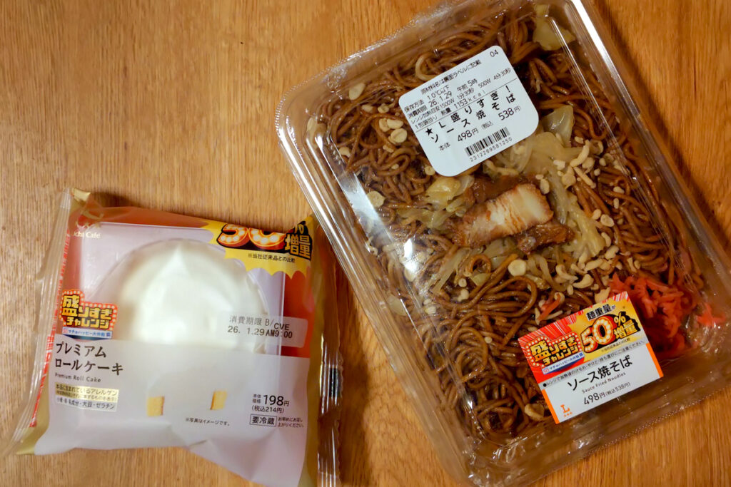 ローソンが2026年1月27日(火)から開始する「盛りすぎチャレンジ」ですが、一部商品が先行して1月26日(月)から販売しています。いつもタイミングが悪く売り切れているのですが、今回はたまたま入ったローソンで出会えたので思わず購入。買ったのはデカすぎる焼きそばとプレミアムロールケーキ。