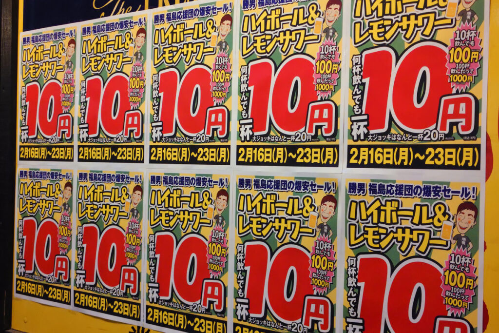 ふくまる通りにある福島応援団勝男が、2026年2月16日~23日にドリンクセール開催。メチャクチャ安いので、酒好きの人は行ってみては。
