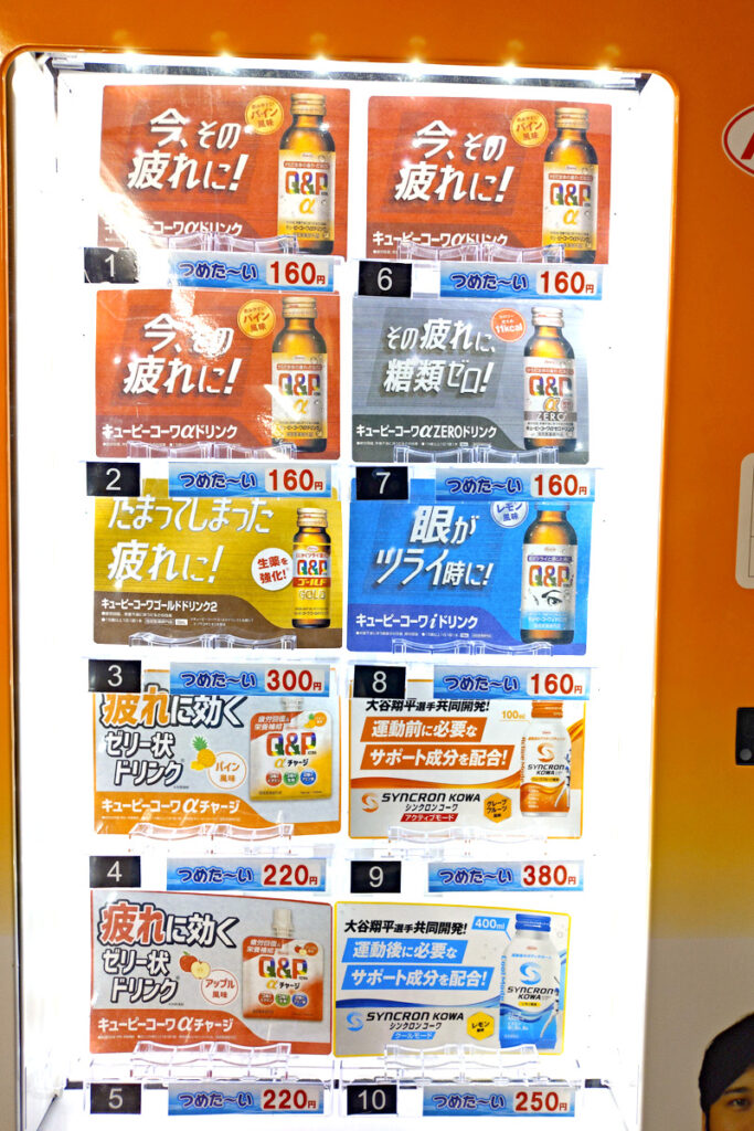 栄養ドリンクやゼリーなどが売ってました。通勤途中、シャキッとしたいときに買う感じになるんでしょうか。どうしてもシンドイ時は買ってみてはいかがでしょうか。